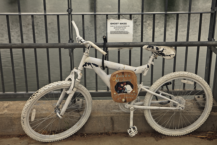 There are several of these “ghost bikes” in different parts of Austin. They are left at or near the place a biker was killed, usually by a careless motor vehicle driver. This bike is on the Pflugerville Bridge which spans Lady Bird Johnson Lake in downtown Austin. There is another on 6th Street near Blanco, and another off of the 360 Loop, west of Mopac.