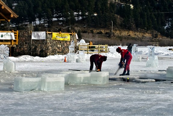 Each January 1st, people pay money to a local charity for the privilege of plunging into frozen Evergreen Lake in Evergreen, CO. This image shows members of the volunteer fire department cutting ice blocks to make openings for the local crazies to take the plunge.