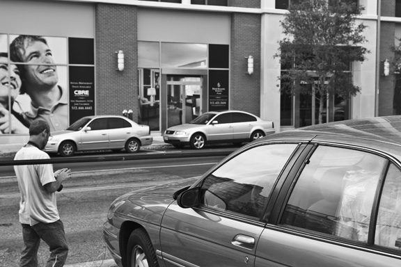 Urban Street scene in black and white. Signage with faces looking up, walker checking his phone – all on a Saturday morning in Austin, Texas.