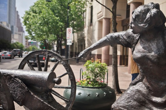 This statue is on Congress Street in Downtown Austin, Texas. Ms. Eberly was out and about one Saturday morning, in the early days of the Republic of Texas, and noticed that a band of soldiers led by Sam Houston, the hero of the Texas secession from Mexico, were looting the unguarded state archives. Angelina primed the old cannon and fired a shot which woke local officials who were able to round up Houston’s troops, preserving the day for the new City of Austin. Were it not for her heroism, the State Capital would have moved to Houston. We all know how bad that would have been. Houston the State Capital? No way!!