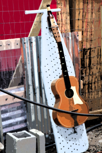 I stumbled upon this collage of things and found the guitar, ironing board, and bottle of beer amusing. Wish the musician had been around so I could ask him or her about it all.