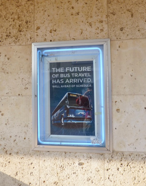 According to this poster the future of bus travel has arrived – ahead of schedule.  For the first 3 hours of my 25 hour ride to Denver, I enjoyed the future of bus travel.  The next 22 hours were very different.  When I transferred in Dallas I was put on a bus that smelled like the commode that was at the back of the bus, had busted seats which would not recline or, if they did recline, they would not return to a straight up position.  The seats, floor, etc were filthy. The station attendants were rude and entirely unhelpful.  I thoroughly intend to try to get a partial refund next week.